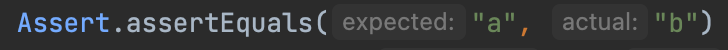 assertEquals의 앞에는 나오기 기대되는 값이 오며, 뒤에는 실제 테스트에서 나온 값이 온다. 예를 들어 테스트에서는 "b"가 나왔는데 나오기를 기대한 값은 "a" 라면 다음과 같이 작성된다. 만약 둘이 같다면 테스트가 통과되고 다르다면 테스트가 실패한다.