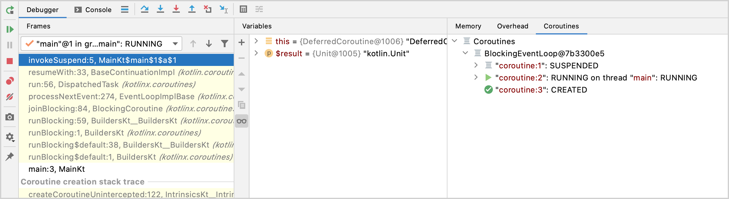 IntelliJ IDEA 디버거를 사용하면, 코드를 디버그 하기 위해 각 Coroutine을 깊게 팔 수 있다.