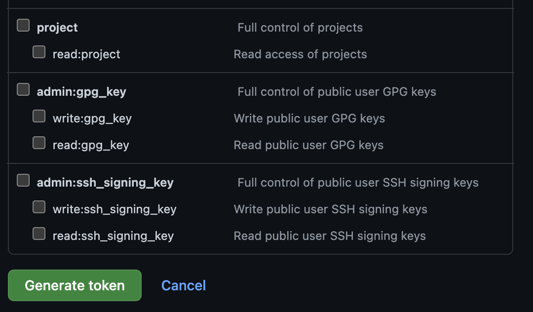 2. 어떠한 권한도 선택할 필요가 없으며, 페이지 하단의 Generate token을 선택한다.