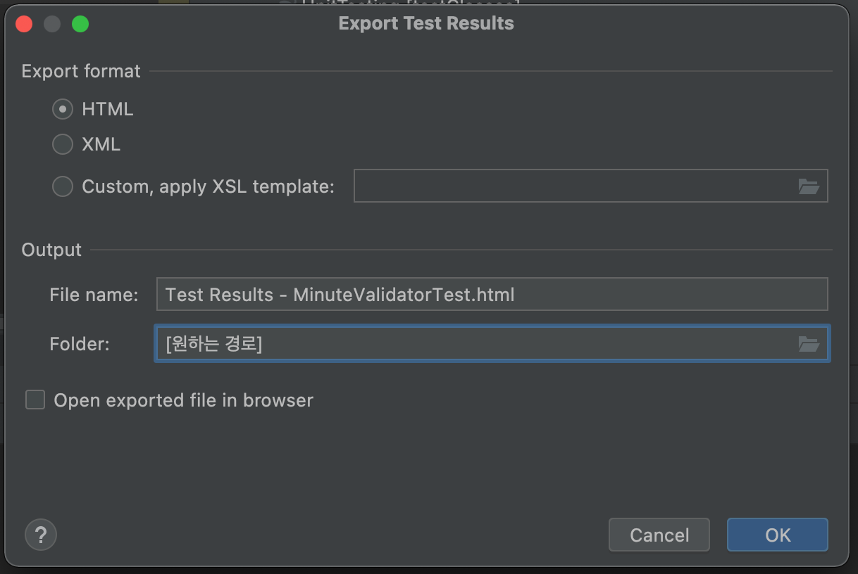 이 파일을 다른 곳에 저장하기 위해서는 Export Test Results... 버튼을 누르면 된다.