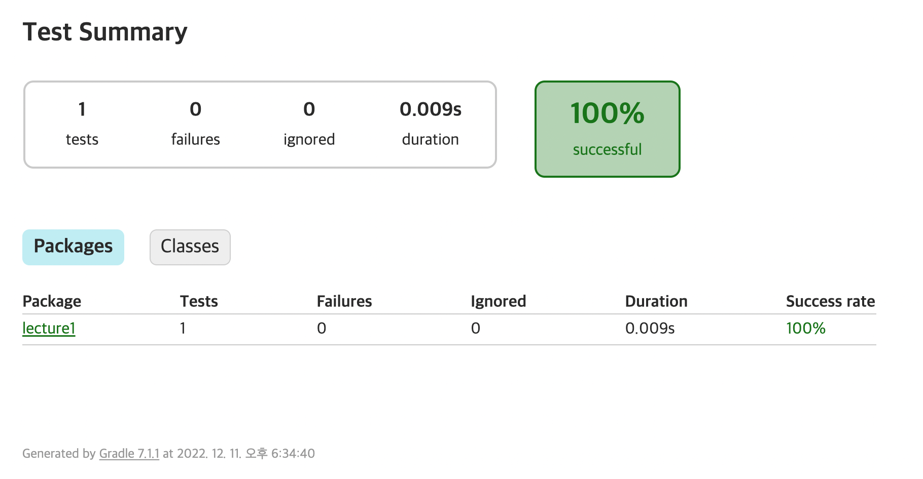 저 버튼을 클릭하면 Gradle에서 생성한 테스트 리포트가 아래와 같이 나오게 된다.