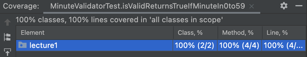 이를 실행하면 MinuteValidator에 대한 테스트 커버리지가 다음과 같이 나오게 된다. 커버리지는 Class 단위, 메서드 단위, 라인 단위로 모두 확인할 수 있다.