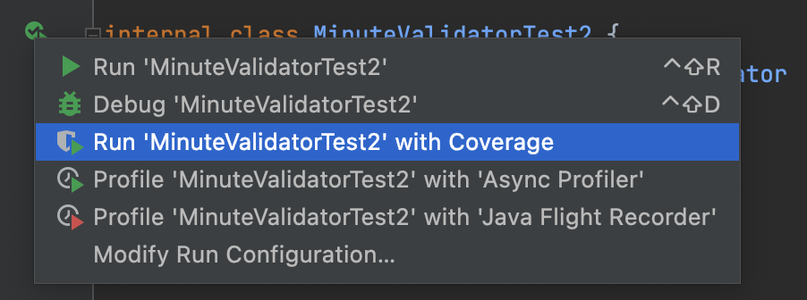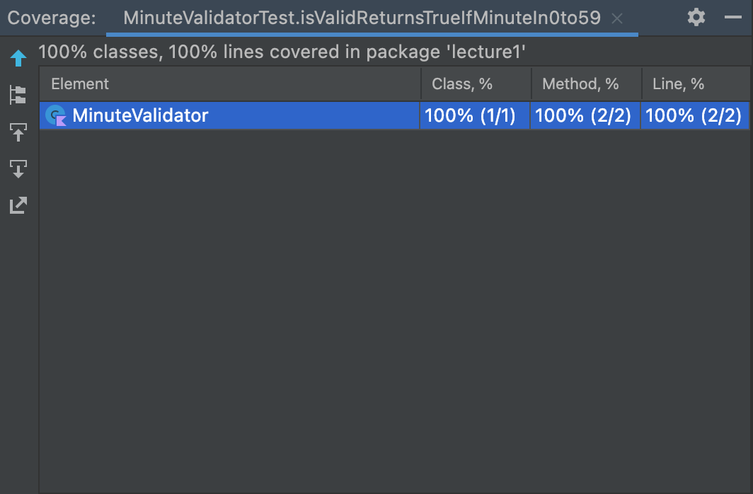 이를 실행하면 MinuteValidator에 대한 테스트 커버리지가 다음과 같이 나오게 된다. 커버리지는 Class 단위, 메서드 단위, 라인 단위로 모두 확인할 수 있다.