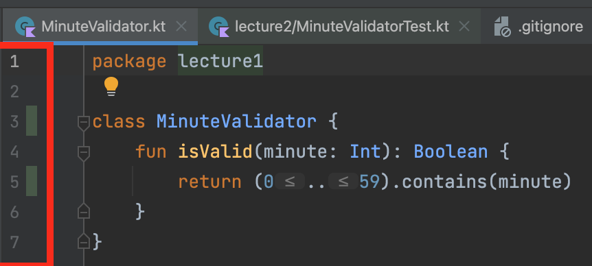 또한 MinuteValidator 클래스 내부에 들어가 보면 Line 에 초록색 네모박스 표시가 되어서 어떤 Line이 테스트 완료되었는지를 확인할 수 있다.
