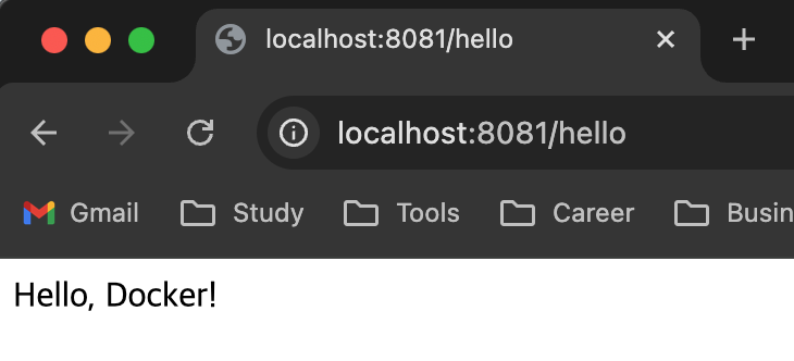 localhost:8080/hello 로 접속하면 Hello, Docker! 가 잘 프린트 되는 것을 볼 수 있고