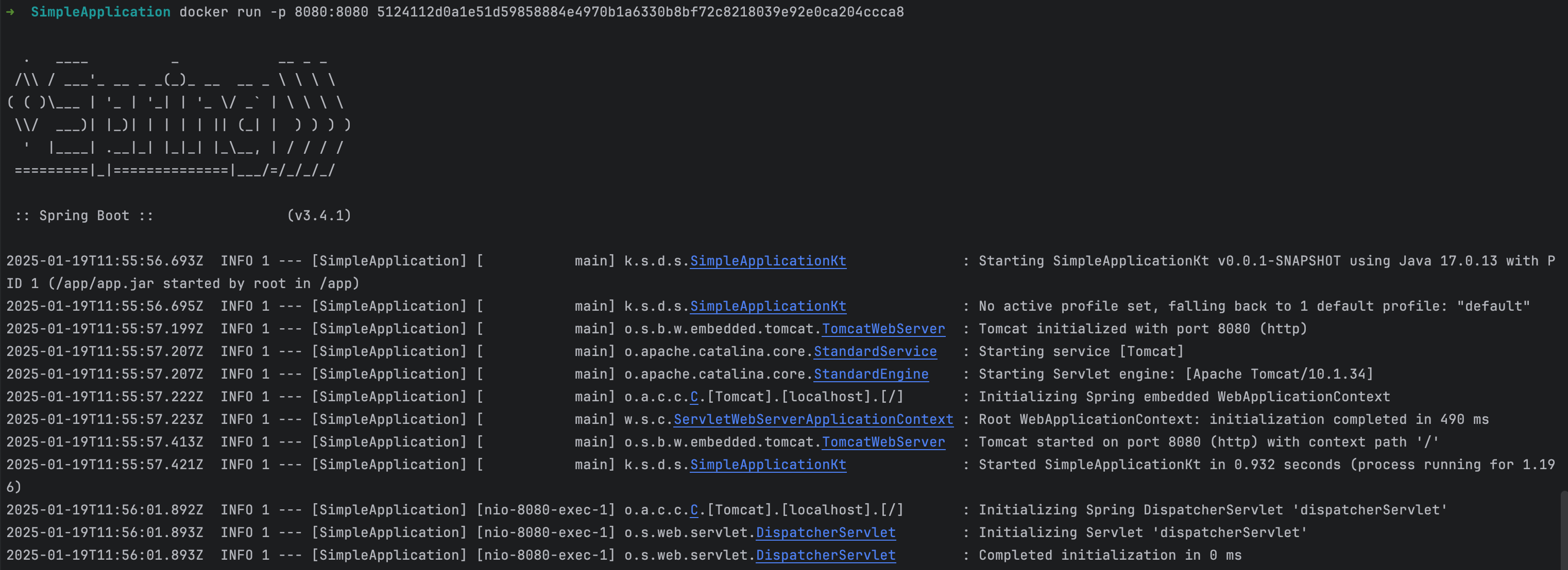 만약 같은 이미지를 사용해 스프링 애플리케이션을 하나 더 실행하고 싶다면, 다음과 같이 기기의 포트만 바꿔서 실행해주면 된다.