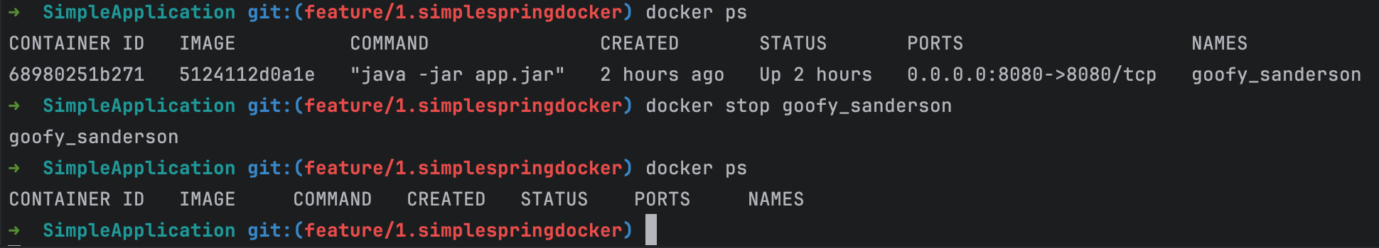 컨테이너의 이름은 docker ps의 맨 마지막 열의 NAMES에서 확인할 수 있으며 중지하면 더이상 해당 컨테이너가 docker ps로 조회되지 않는다.