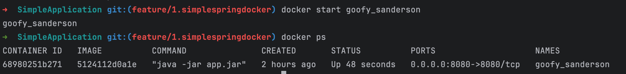 예를 들어 위에서 중지한 goofy_sandeson 컨테이너를 재실행하려면 다음 명령어를 실행하면 된다.