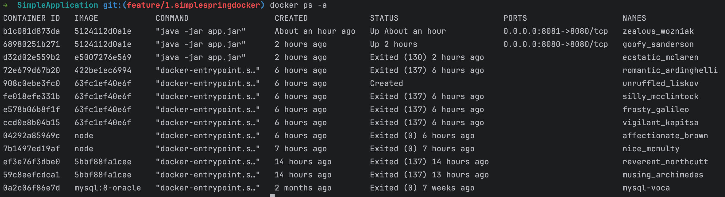 만들어진 모든 컨테이너 목록은 docker ps에 -a 옵션(all 옵션)을 줘서 확인할 수 있다.