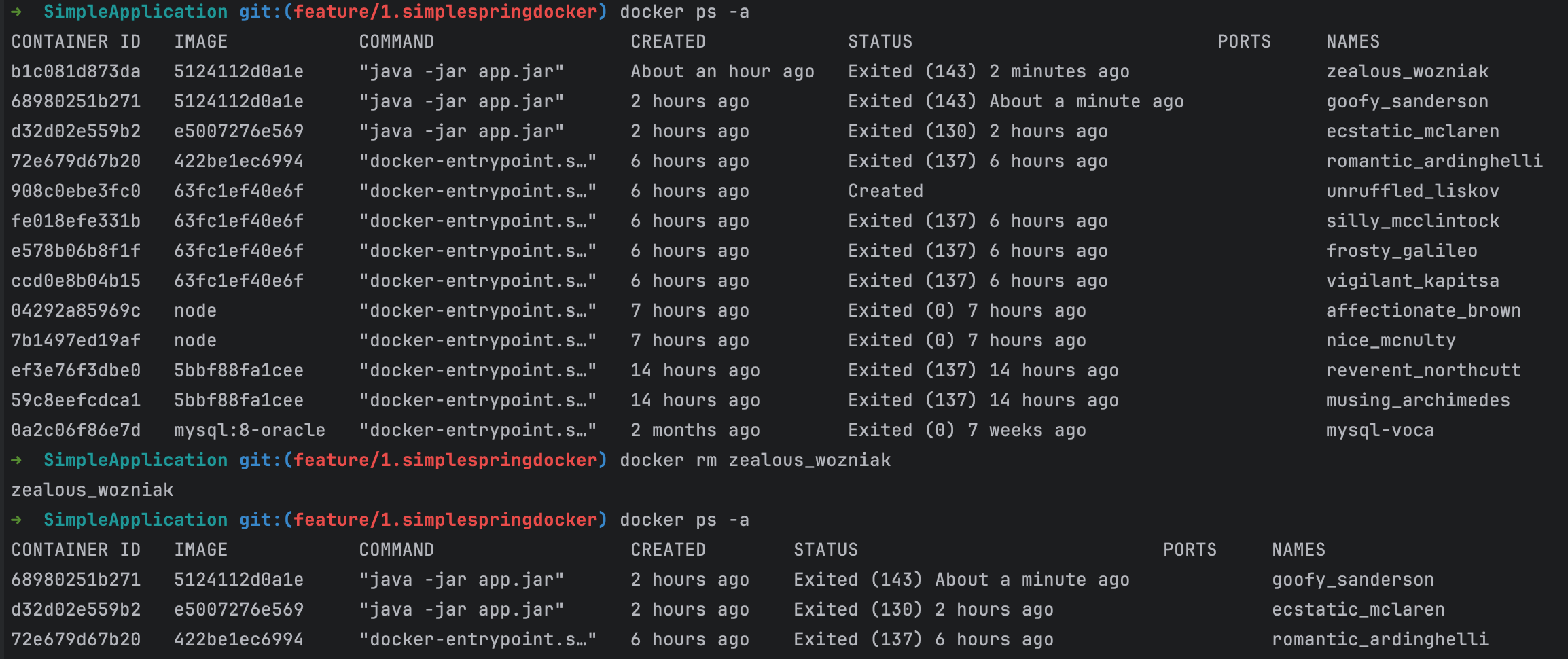 예를 들어 zealous_wozniak 컨테이너를 삭제하고 싶다면 다음 명령어를 실행하면 된다.