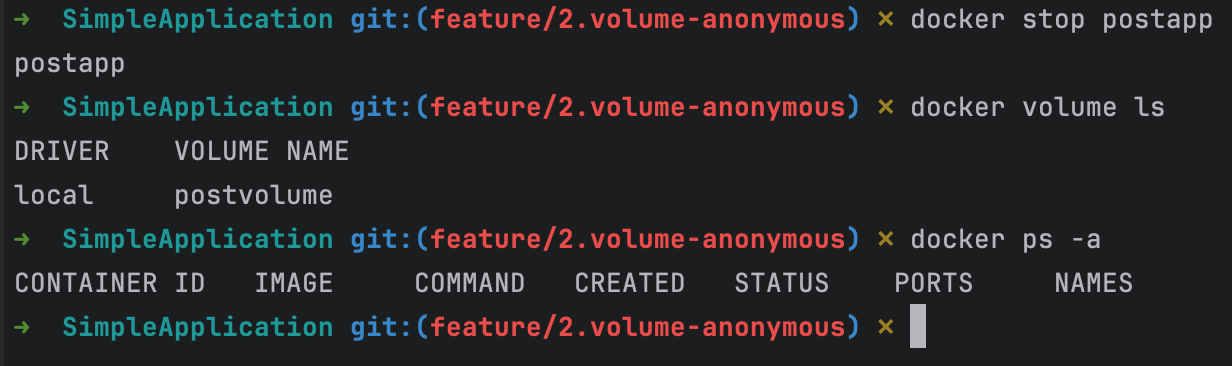 이제 이 postapp을 stop 하면, 볼륨은 유지되고(volume ls) 컨테이너는 지워진 것(docker ps -a)을 확인할 수 있다.